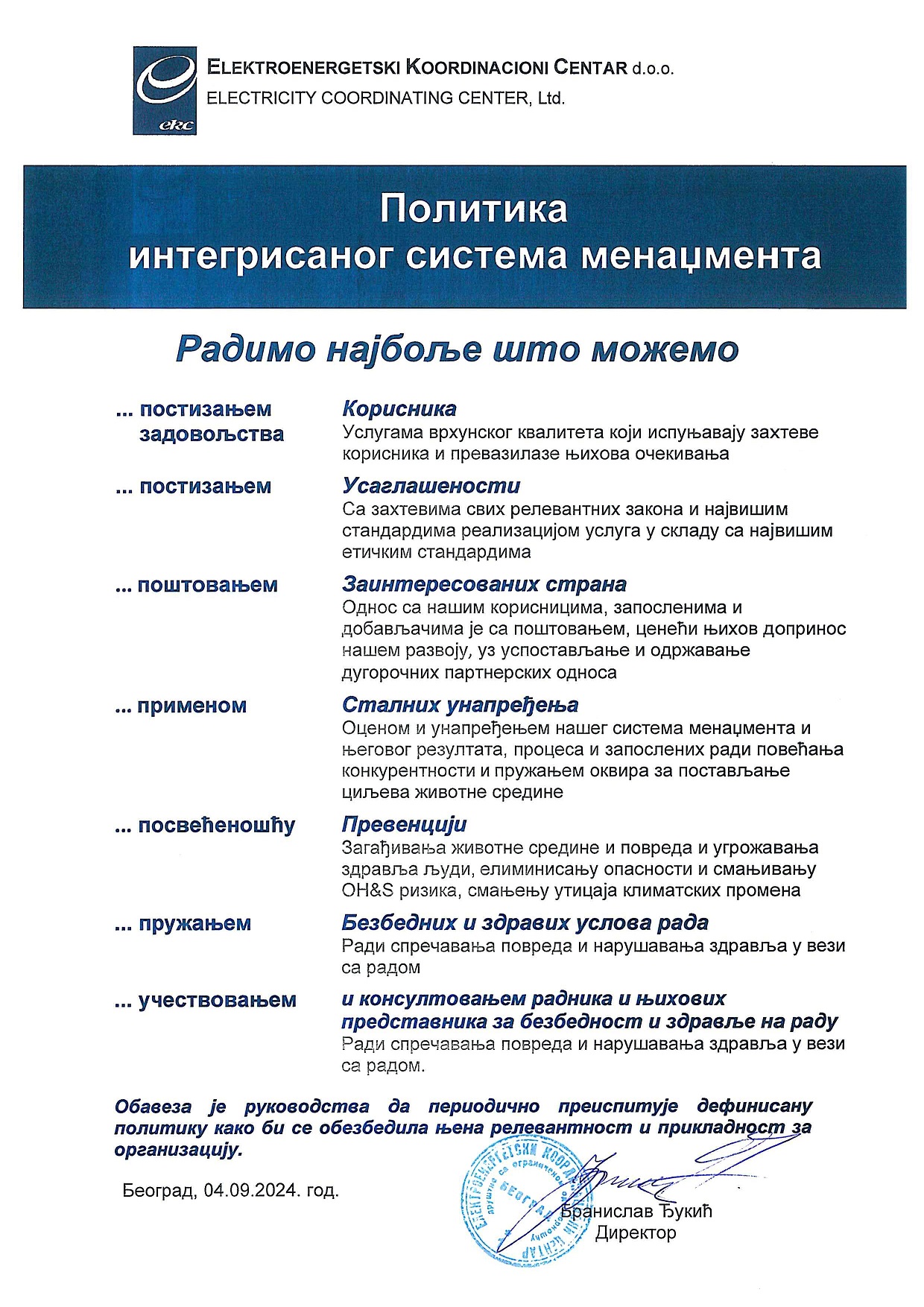 Politika integrisanog sistema menadžmenta EKC d.o.o.